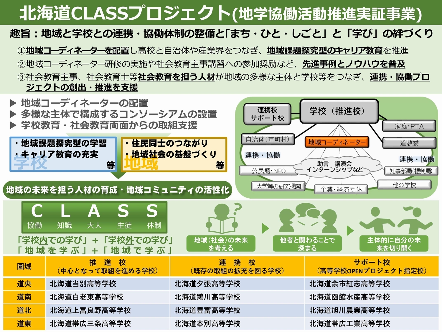 学校と自治体や企業等の産業界、団体等をつなぎ、取組を推進する要となる地域コーディネーターを配置するとともに、地域の企業や経済団体、NPO等、地域の多種多様な人材からなるコンソーシアムを設置し、高校生と大人が一緒に地域課題を解決する地域課題探究型の学習体験を通じて、持続可能な地域と学校の連携・協働の仕組みを構築し、地域の未来を担う人材の育成を目指したもので、本校は、令和3年度から令和5年度まで、道東圏域の推進校として、北海道教育委員会から研究指定を受けていました。