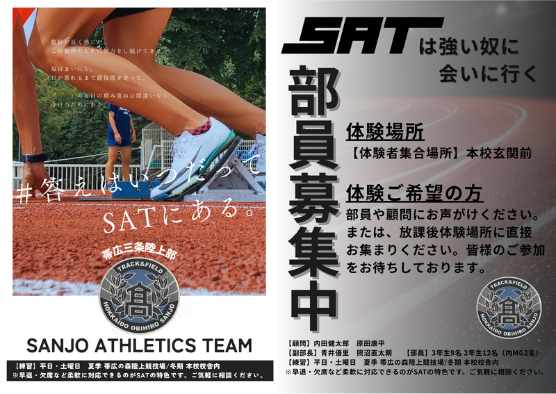 R8ポスター 投稿日時 : 19:01 部活動顧問 本日対面式があり、陸上部は例年通り動画で部活動紹介をいたしました! 今年度は何人入ってくれるか、顧問、現役SATと楽しみでなりません。 明日も学校で行いますので、是非見学だけでも来てください! 初心者も、マネも大募集です! 皆で盛り上げていきましょう! そして今回のポスターは…以下になります!※ポスター作製者 Mr.WindSpace 上手く受取ができず2枚の掲載となりましたが、あと1枚、校内のどこかに張ってあるはずです! 是非探してみてください! Tweet {{options.likeCount}} {{options.likeCount}} 0 コメント